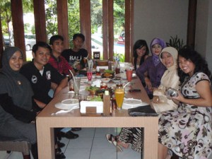 Pertemuan ini adalah pertemuan pertama saya dengan bunda, uda dan mbak Icha namun pertemuan kedua untuk Wijna dan Muzda. Pertemuan gado-gado dengan rentang usia dan latar belakang profesi yang sangat bervariasi. Walau begitu, tak ada rasa sungkan lhooo di antara kami.. Tawa renyah juga canda riuh renda terdengar di sela-sela pembicaraan. Wih! Saya bahagia sekali bisa ketemuan! 😉 For me it means putting a writing into a face 😉 . Dan seperti biasa bibir ini berceloteh ria tanpa ada remnya padahal semua sudah kelaparan. Sudah dua kali uda Vizon coba menawarkan agar kita memesan makanan tapi dasar lagi kesenengan ya tancap gas aja terus nyerocos 😀 hahaha. Hingga tiba-tiba bunda Dyah Suminar datang. Wow! It’s a surprise 😉 It’s an honour to meet the lady of this city; ibu Walikota Yogyakarta. Saya pernah beberapa kali menyambangi blog beliau, namun… ketemu langsung? Weleh! Ini namanya rejeki!! (minjem kata-katanya bunda Tuti) hehehe. Jadi cap cip cus… pesan makan plus lanjut ngobrol poto-poto donk ;).