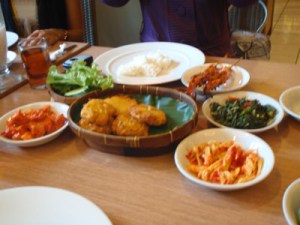Berhubung saya sedang diet (caution: married itu bikin gemuk! :P) maka hanya beberapa sendok nasi saja yang saya taruh ke piring makan. Dan ternyata itu sukses bikin bunda Tuti misuh-misuh karena dianggap mempermalukan beliau yang udah duluan menyendok nasi agak banyak (padahal nasinya bunda gak beda jauh lho sama saya.. sama-sama dikit koq). Hihihihi. Bun.. Bun… belum tau aja strategi saya, emang makan nasi cukup sedikit saja. Tapiiii itu karena saya menyisakan ruangan untuk dessertnya! 😛 hehehe.