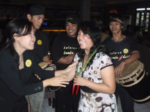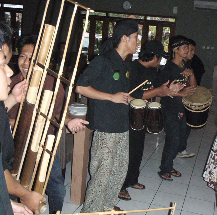 Sementara asyik terkekeh-kekeh bercerita panjang lebar mulai dari jalan pantura hingga pantai nan indah di Jogja, telinga saya menangkap bunyi-bunyian yang agak keras dari arah pintu. Ribuuut banget! Jadi mau tak mau kepala ini menoleh kebelakang. Semua orang di dalam restoran itupun menoleh ke arah suara. Dan saya liat para pelayan restoran membawa gendang, angklung, ya berbagai macam instrumen musik sambil bernyanyi-nyanyi.