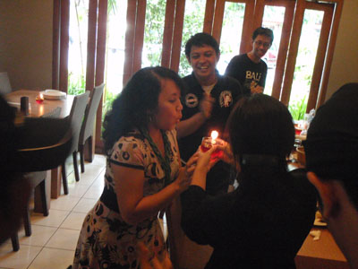 Sungguh ini benar-benar kejutan yang tak terduga. Memang kemarin bertambah lagi usia saya dibumi ini, namun sungguh saya gak mengira kalau sahabat-sahabat maya yang baru pertama kali bertemu, mau repot-repot menyiapkan acara special begini. Full music, ada tumpeng beras merah putih, ada kalung kacang panjang dengan cabai merah yang besar. Ada sahabat-sahabat maya yang sekarang menjadi sahabat nyata begitu tulus mendoakan yang terbaik untuk hari jadi. Sungguh saya terharu. Udah mau nangis rasanya, nangis bahagia tentu, tersentuh dengan cinta kasih yang dinyatakan. Namun karena suasana begitu ceria dan pemain musik tarling ngerjain saya, mulai dari disuruh potong tumpeng, makan tumpengnya hingga disuruh tiup lilin pengusir laler 😛 rasa haru tersebut terlampiaskan dengan senyum sukacita. Rasanya indah, rasanya bahagia.. dan sungguh saya ingin berbagi rasa itu kepada semua teman-teman blogger.