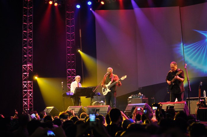 Setelah saya hampir menyerah karena menanti sekian lama, akhirnya panggung terbuka, lampu-lampu dinyalakan dan….. tadddaaaa….. Empat pentolan Fourplay: Bob James (keyboards), Nathan East (bass), Harvey Mason (drums) dan Chuck Loeb (guitars) tampil menghentak dan membuat lupa pegelnya kaki atau dongkolnya hati yang setia menanti tadi. Yang ada saya teriak-teriak seneng :mrgreen:.