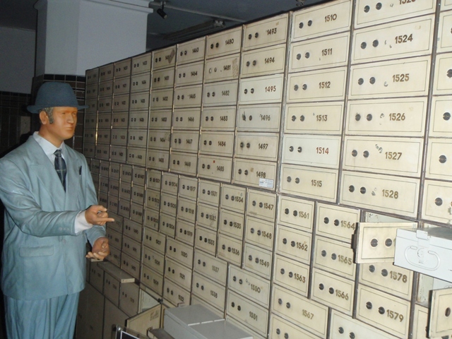 Di dalam Museum Mandiri, kami diajak berkeliling ke ruang basement. Ada ruang penyimpanan uang (brankas) ada juga patung-patung lilin yang menggambarkan transaksi keuangan zaman dulu