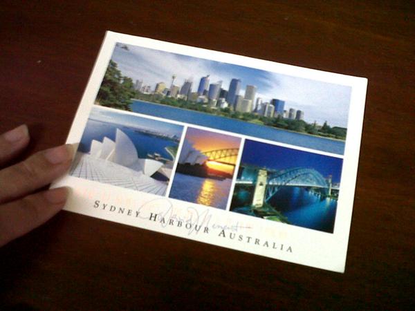 Setelah itu, meja saya kembali dikunjungi oleh sebuah kartu pos. Menarik dengan gambar pemandangan dan kalendar Masehi bulan Mei 2011 kiriman dari Restu, perempuan muda yang mendapatkan jodohnya dengan cara yang unik. Tidak berhenti disitu, masih dominan dengan warna putih, kartu pos lain juga memeriahkan sepetak meja kerja saya. Kartu pos dengan gambar indah Sidney harbour dari berbagai angle itu dikirimkan kawan blogger dari Australia, Bung Donny Verdiant. I like the post card, very vibrant.