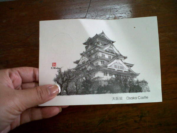 Beberapa waktu lalu saya menerima sebuah kartu pos. Warnanya putih dengan gambar sebuah kastil yang kokoh. Empat lantai tingginya dan terdapat atap segitiga di setiap tingkatnya. Cantik. Kartu pos ini dikirimkan oleh sahabat saya @Venniem yang waktu itu sedang plesir ke Osaka. Ah, kamu memang pandai membuat saya iri Ven, kalau tak ingat biayanya rasanya ingin segera mengepak koper dan terbang kesana ^_^.