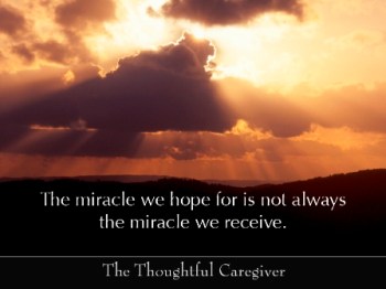 Mukjizat kesembuhan itu adalah hak preoregatif Gusti Allah, iya saya memohon kesembuhan tapi saya tidak bernegosiasi dengan Tuhan bahwa kalau suami saya sembuh saya akan begini begitu. Tidak. Saya akan melakukan apapun yang memang Tuhan kehendaki untuk saya lakukan dengan atau tanpa mukjizat kesembuhan diberikan kepada suami saya. Mengapa? Karena seluruh hidup saya ini miliknya Tuhan, saya ini cuma numpang hidup di bumi yang merupakan pemberhentiaan sementara. Sehat, sakit, itu adalah fase kehidupan yang merupakan haknya Tuhan dan saya akan selalu berusaha ikhlas menjalani.