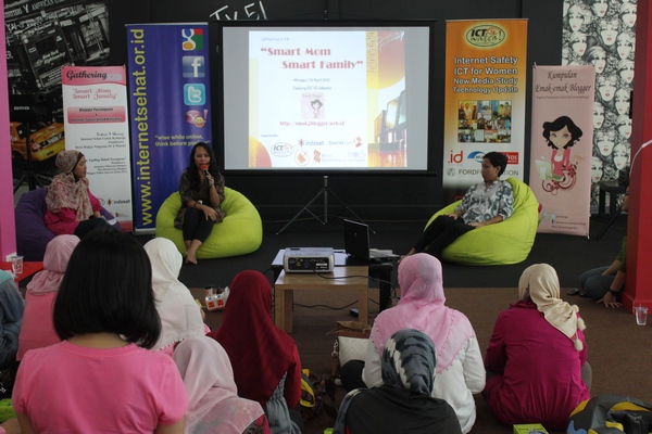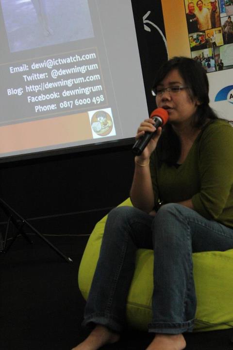 Sesudah saya sharing mengenai hal tersebut, Isnuansa pun bercerita mengenai asal mulanya ia ngeblog dan berbagi tips-tips seru supaya blognya ramai serta terhindar dari hilangnya konten blog yaitu dengan cara back-up manual maupun back-up berkala yang dilakukan melalui tool di weblognya. Setelah itu acara yang dinanti pun hadir, yaitu Mbak Dewi dari ICT Watch yang berbicara mengenai Perempuan dan Internet Sehat. Sharingnya menarik sekali, semacam jadi melek bahwa selain pornografi maka kita juga harus mawas diri mengenai penyebaran identitas pribadi yang mungkin tanpa sadar kita lakukan ketika berselancar di dunia maya. Emak-emak peserta dengerin, ada banyak hadiah soalnya 😉