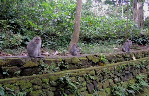 Sacred Monkey Forest ini adalah taman seluas 13 hektar yang asri, keren deh pokoknya! Pohon-pohon besar dengan monyet-monyet berlarian bebas. Tapi hati-hati lho, monyet-monyet di sini kurang ramah, saya lihat ada turis lari-lari dikejar monyet yang minta pisang. Dan begitu turisnya ketangkep, booow itu monyet porno banget: turisnya digerayangin! Kantong-kantong celananya diperiksa si monyet, duh kayak ngeliat aksi penggerebekan polisi ke penjahat saja. Cuma bedanya disini yang jadi polisi adalah monyet dan penjahatnya manusia 😀 Dunia sudah kebolak-balik nampaknya :mrgreen: