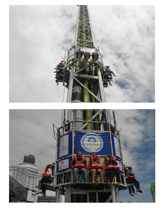 Begitu melihat tiang yang menjulang tinggi ini, saya langsung menelan ludah. Alamak, tinggi amat ya. Lalu kalau dijatuhkan ke bawah begitu, gimana rasanya? Ditengah kebimbangan, Adrian, suami saya berbisik, “hayo kamu berani gak? Are you a loser or a winner?Waduh! Ditantangin begitu, darah Batak saya mendidih. Hey, jangan ada yang nantangin Eka ya, langsung dijabanin deh :D. Kemudian bareng Adhi dan Leoni, saya naik Space shot. Pasang seat bealt dan senyum-senyum buat di foto dari kejauhan.
