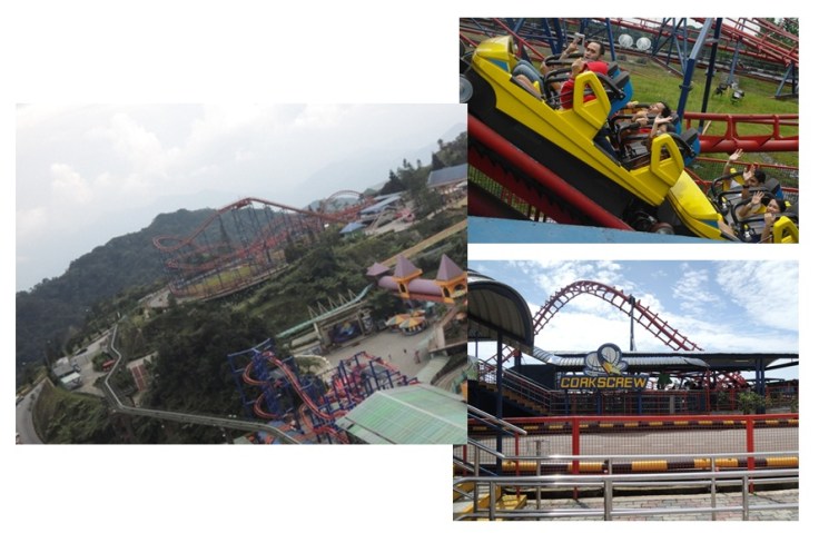 Berlanjut ke wahana berikutnya adalah Corkscrew. Ini semacam halilintar kalau di Jakarta sini.Hemm antriannya lumayan ya, tapi tenaaang. Pakai express card, bisa langsung naik tanpa ngantri lho ^_^. Corkscrew ini adalah salah satu wahana yang saya tunggu-tunggu, soalnya dari jendela kamar hotel kelihatan bow! Duh, dari pertama datang tuh kayak udah mengundang buat dicobain. Saya dan Adrian memilih duduk di tengah kereta. Berdasarkan pengalaman, kalau duduk di depan dan di belakang tuh goncangannya terasa banget. Well, setelah sport jantung di Space shot, saya mau cari aman deh 😀 Hahaha.