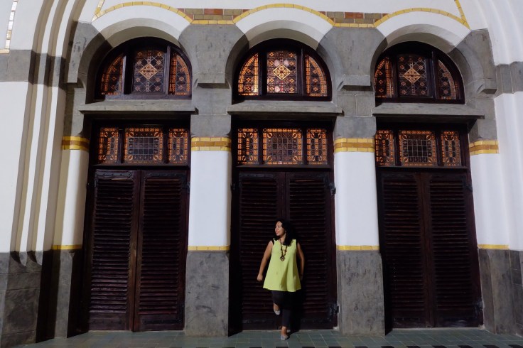 Memasuki areal Lawang Sewu ternyata suasana nggak seseram di bagian depan. Lampu-lampu terang bersinar sehingga gedung terasa dramatis megahnya. Kaca patri yang masih dalam kondisi bagus menambah elegan tampilan gedung tua ini. Cantik. Tapi walau cantik, tak bisa dipungkiri bulu di tengkuk saya tetap nggak mau bobok, setia berdiri bikin telapak tangan saya sedingin kulkas. Saya diam melihat situasi, sepertinya teman-teman lain hepi-hepi saja. Akhirnya saya pun membaur bersama teman-teman untuk tur ke dalam dikawani Bapak Pawang. Iya, disebutnya pawang! Bukan pemandu atau tour guide. Embuh pawang apa, saya berdoa pawangnya beneran manjur aja 😀 hahaha.
