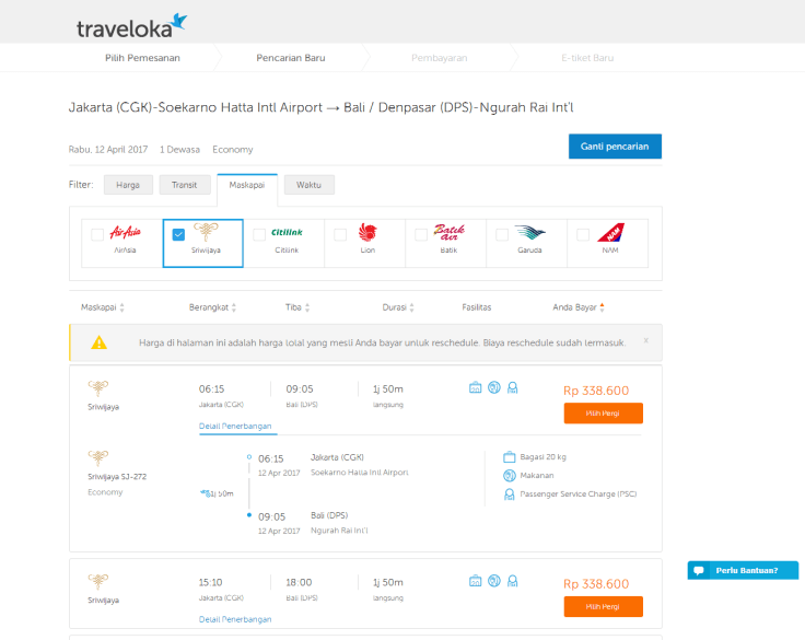 3. Beberapa maskapai mengizinkan penggantian tanggal, jam, rute, dan maskapai. Tapi ada pula yang hanya mengizinkan penggantian tanggal dan jam penerbangan. Cek and ricek saja ke bagian syarat dan ketentuan di Traveloka untuk mengetahui kebijakan setiap maskapai. Untungnya sih, Sriwijaya bisa ganti hari dan jam.