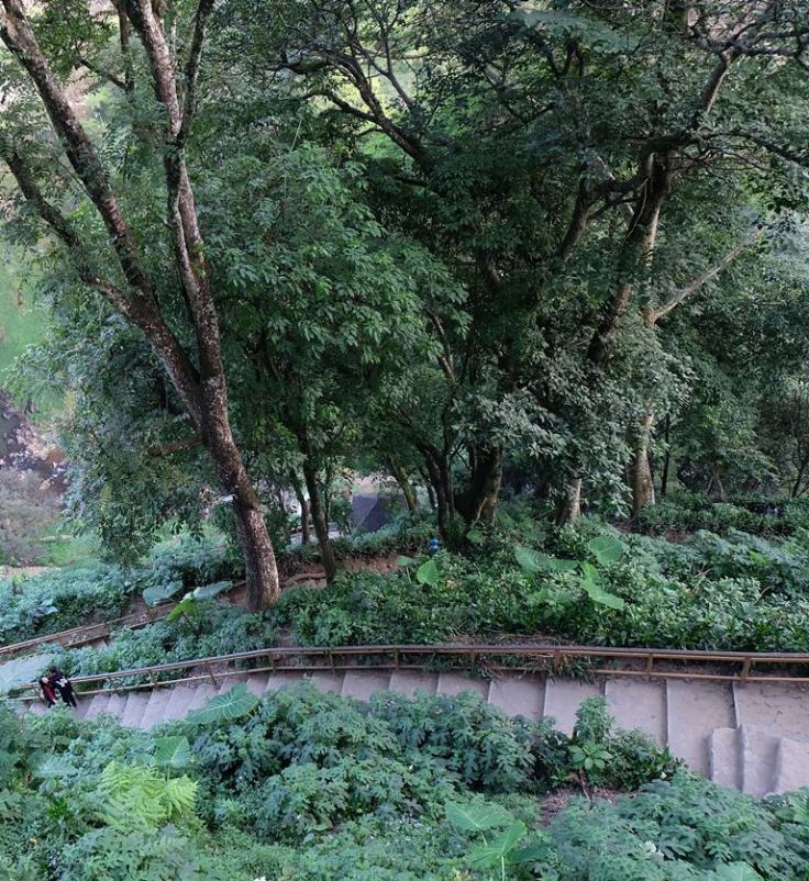 Setelah berjalan turun kurang lebih 15 menit, kami berhenti sebentar. Keinginan tinggal keinginan, berhubung saya menyambangi Curug Cimahi ini bersama anak dan mamak saya yang usianya sama-sama balita jadi sampai di teras balkon kedua udah pada nyerah. Lho kok balita? Maksudnya gimana? Hihihi, balita itu artinya bawah lima tahun (anak saya), dan batas lima puluh tahun (mamak saya). Hahaha.