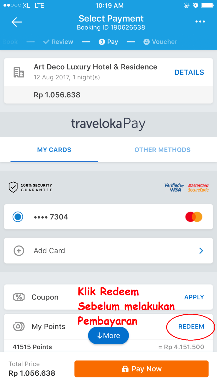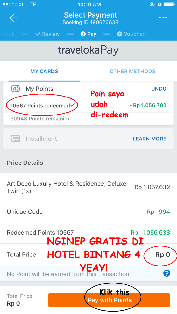 Cara menggunakanLoyalty Point Traveloka itu gampang banget segampang dapetinnya. Langkah utama yang harus dilakukan adalah sign up sebagai member Traveloka App. Kemudian kita tinggal melakukan transaksi pembelian baik tiket pesawat maupun hotel. Lalu pas mau bayar, kita tinggal pilih menggunakan point. Kalau point kita banyak maka seluruh harga transaksi bisa dibayar pake point alias gratis (seperti saya kemarin). Tapi kalau point kita nggak sebanyak harga transaksi, kita akan tetap bisa menukar point yang nantinya akan potong harga pembayaran kita. Cek aja gambar di bawah ini waktu saya pesan hotel buat menginap di Bandung.