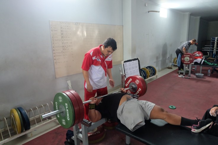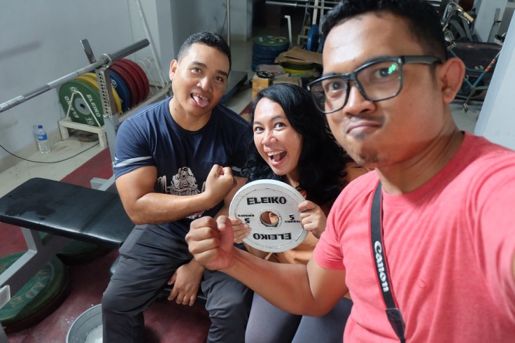 Berbeda dengan di lapangan panahan yang suasananyaa teduh dan mendayu, aura penuh kompetisi langsung tercium saat saya sampai di lantai 3 Kantor NPC Indonesia yang menjadi tempat latihan para atlet  angkat besi. Terdapat 6 tempat tidur khusus yang berjajar menjadi alas buat atlet berlatih mengangkat barbel besi. Dari seluruh penjuru ruangan terdengar teriakan-teriakan meledek yang berfungsi memotivasi.