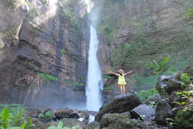 Mata saya terpana melihat air terjun dengan debit air yang begitu deras. Tetes demi tetes air berkumpul menjadi satu lalu terjun bebas dari ketinggian menghasilkan suara menderu yang memekakkann telinga namun memberikan kedamaian di jiwa. Saya berjalan mendekat ke arah air terjun yang terlihat sangat magis dengan segala kemegahannya. Walaupun jalanan sedikit licin namun hal itu tidak menyurutkan langkah kaki saya.
