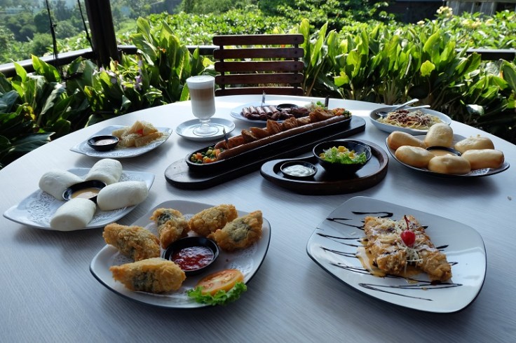 “Belum tau, Teh.” Jawab saya singkat kemudian larut kembali dalam kesibukan sendiri. Beneran deh, sulit menentukan sudut foto yang mau dipakai karena memang semuanya terasa indah di restoran yang sudah berdiri dari tahun 2004 lalu ini. Cemara-cemara hijau menjulang tinggi cantik dengan latar awan putih berarak di langit biru, terasa dramatis dengan makanan-makanan enak yang wanginya aja sudah bikin perut keroncongan! Di sini tuh, mata senang, perut kenyang! Wajar banget kalo restoran ini sangat populer di kalangan penduduk Jabodetabek yang sering refreshing ke Puncak.