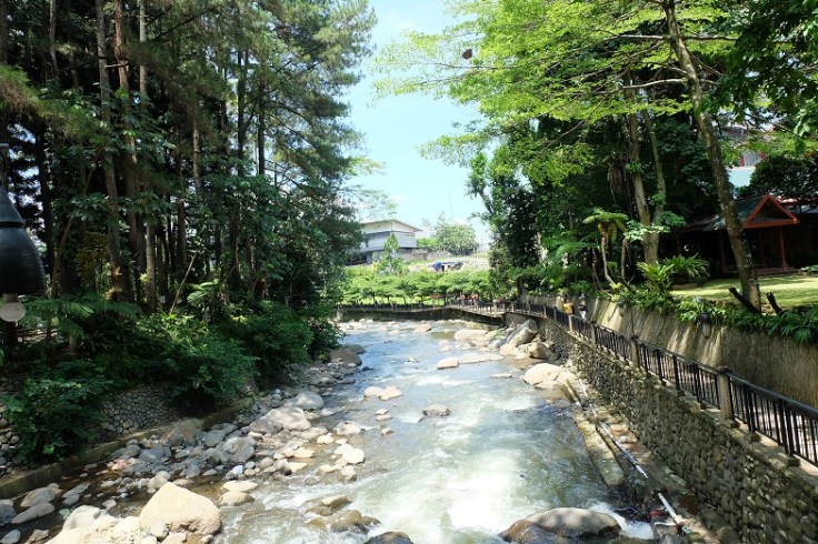 Gemericik air sungai langsung menyapa saat saya berjalan ke arah belakang resto. Saya menemukan sungai besar yang bersih dengan jalan setapak yang ternyata menuju ke jembatan besar. Jembatan besar berwarna hitam tersebut mengarah ke area rimbun di seberang sungai di mana banyak binatang dan wisata edukasi berada. Wah, nggak sabar pengen tahu ada apa di sana!