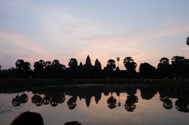 Akhirnya demi kenyamanan, pemandu wisata mengarahkan kami ke sisi kiri Angkor Wat. Not the best spot but that’s okay because it’s less crowded. Kami jadi bisa khusyuk menghayati terbitnya matahari yang pelan tapi pasti menguak ufuk fajar. Magis. Suasananya tenang dan agung, menyuntikkan rasa syukur akan kebaikan Tuhan yang telah membuat jantung kita terus berdetak kuat. Syahdu.