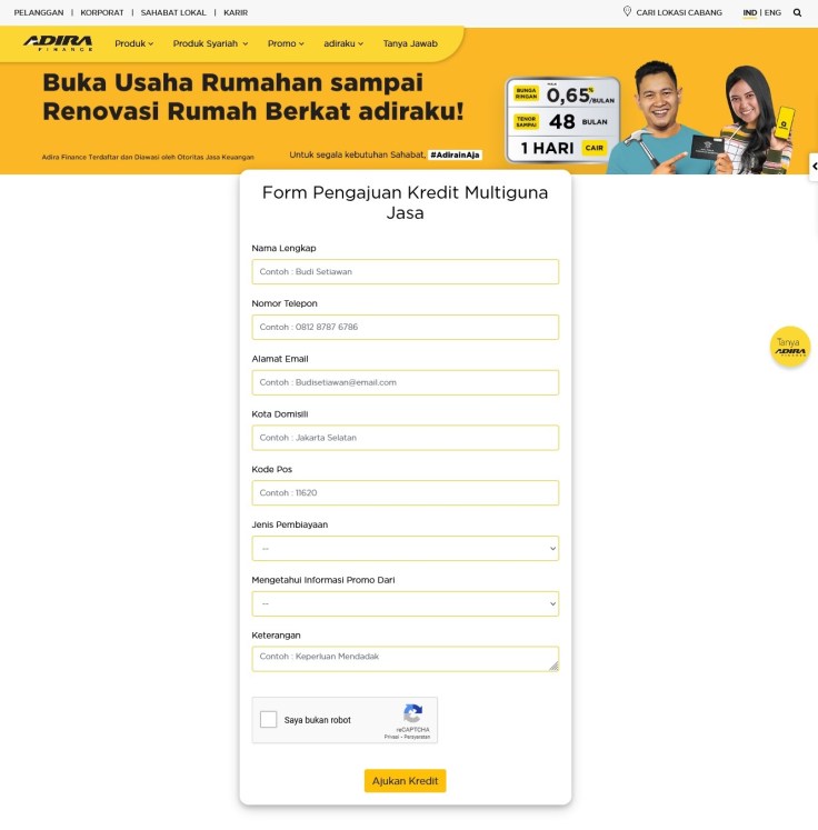 Kemudian alasan berikutnya ya karena cara pengajuan kredit multiguna di Adira itu sangat mudah. Semudah memakai maskara. Hihihi. Cukup isi form, lalu submit dan tunggu aja nanti diproses kok. Form-nya seperti ini. Jangan lupa kalian bilang kalau tau dari blog-ku yaaa.