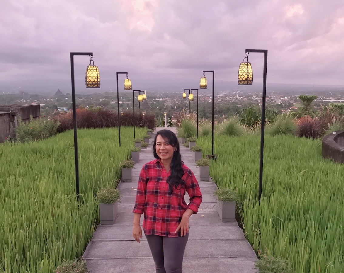Begitu sampai di Abhayagiri, kami langsung disambut petugas yang menanyakan apakah sudah reservasi atau belum. Kemudian diarahkan parkir dan juga ke restorannya. Kami sampai sesaat sebelum senja dan saya pribadi langsung terpukau dengan pemandangannya. Foto-foto sebentar di tengah hamparan padi hijau seraya menikmati Candi Prambanan dari kejauhan. Dari atas sini rasanya lepas bebas dan itu sungguh menyenangkan.