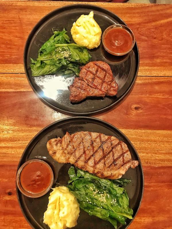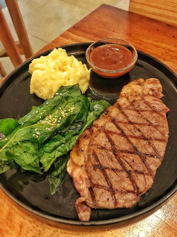 Untuk steak sendiri, ada banyak pilihan daging di sini. Ada yang dari Aussie, NZ sampai USA. Bisa pilih beratnya juga. Saya sih biasanya pilih yang 200 gram namun ada juga porsi besar yang 350 gram. Kondimen yang saya suka mashed potato dan salad (bayam Jepang). Sore romantis itu, sambil menunggu pesanan datang kita ngobrol panjang soal seharian saat tadi terpisah ngapain aja. Matamu lekat memandangi saya, konsentrasi penuh mendengarkan demikian juga saat sebaliknya. Kita bicara, makin lama makin hangat apalagi saat makanan datang. Terus berbagi cerita tanpa henti. Ah, kalo udah begini, bukan cuma baterai hape yang di-charge, jiwa dan raga juga sekalian di-charge. Hehehe.